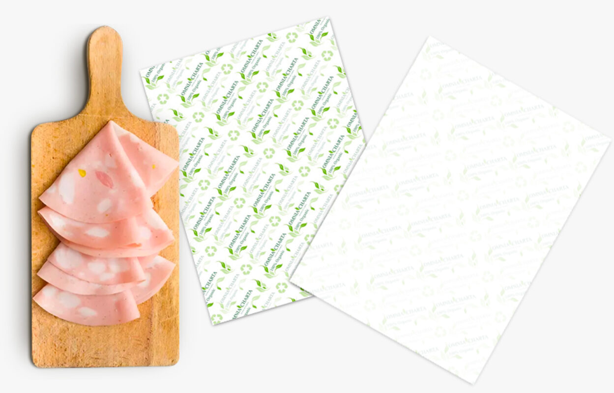 Questa speciale carta per gli alimenti da gastronomia è composta da carta bianca Kraft di pura cellulosa e internamente da carta semitrasparente in pergamin, qualità che la rendono resistente alle contaminazioni alimentari di unto e grasso per una riciclabilità del 100%.